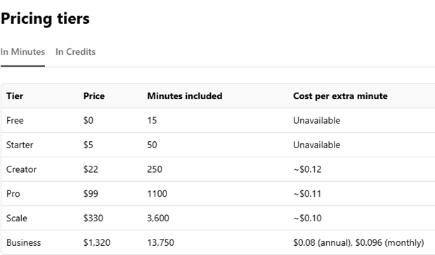 If you’re thinking about cost, you can start with a generous free trial before buying a plan. For many users today, I suspect the Creator plan at USD 33/month (or USD 22/month billed annually) seems like a good choice. With this plan, you get 250 conversational minutes (which is about 4 hours). Below are the different pricing tiers, so there’s an option to suit every budget.