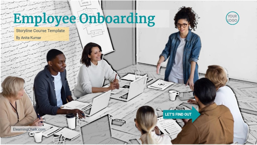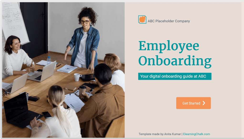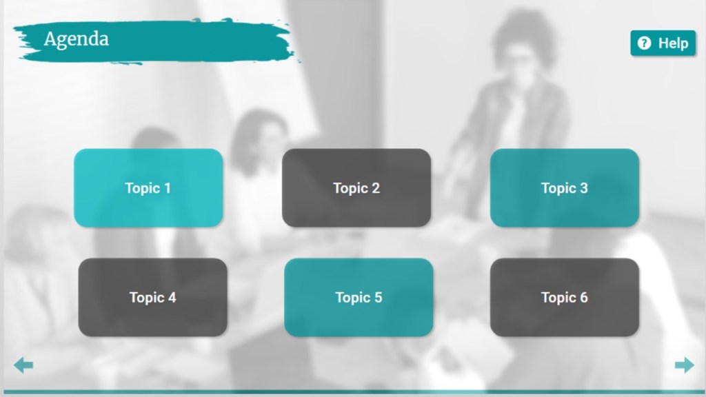 For any project, I design a course template that reveals the overall look and feel of the course, before I develop the final e-learning solution. I designed this elegant and minimalist course template for an Employee Onboarding course. It has a custom menu and a custom course progress bar that blends subtly into the slide layout. I’ve also used an offbeat colour scheme that reflects professionalism and sophistication.