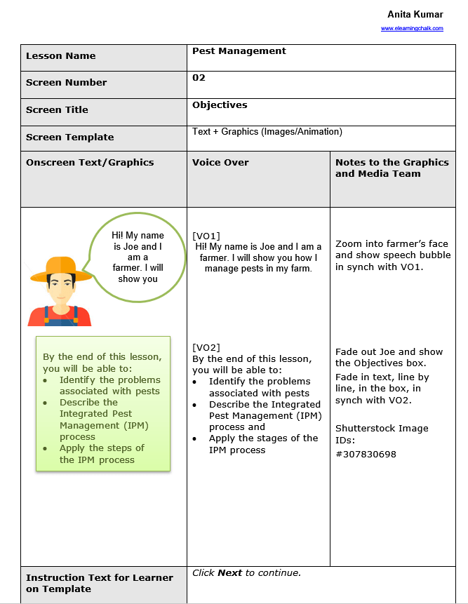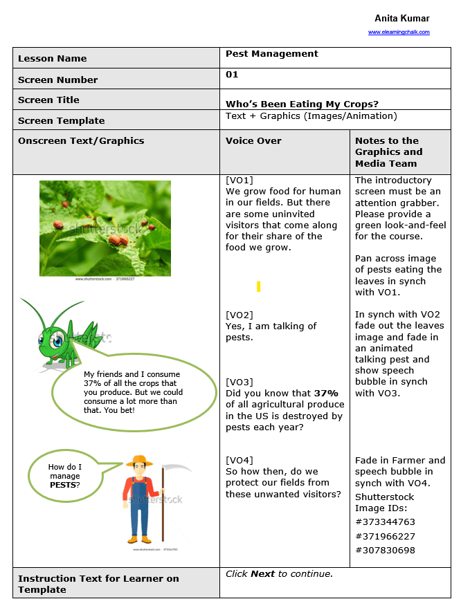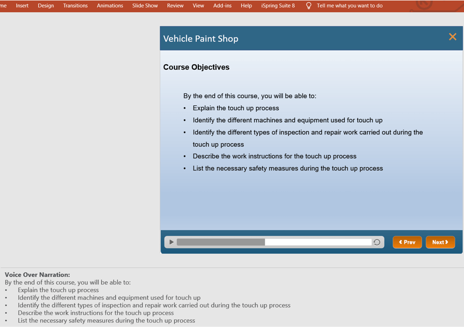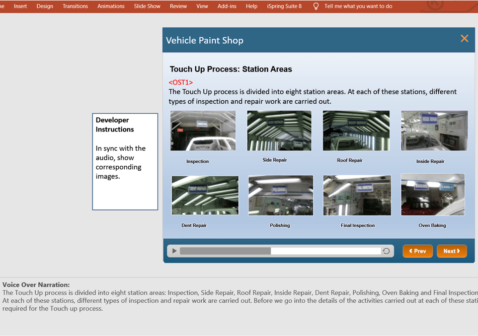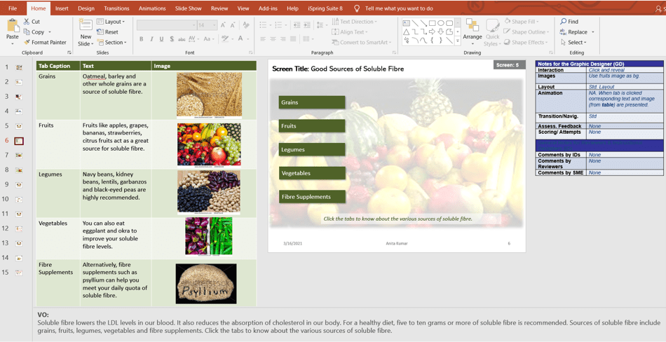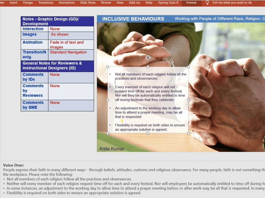 In the PowerPoint storyboard snippets below, you will see how I lay my development and graphic design instructions outside the slide and the voice-over script in the Notes section. As I usually work remotely, I make sure that every little detail is included in my storyboards, making life easier for all the stakeholders.